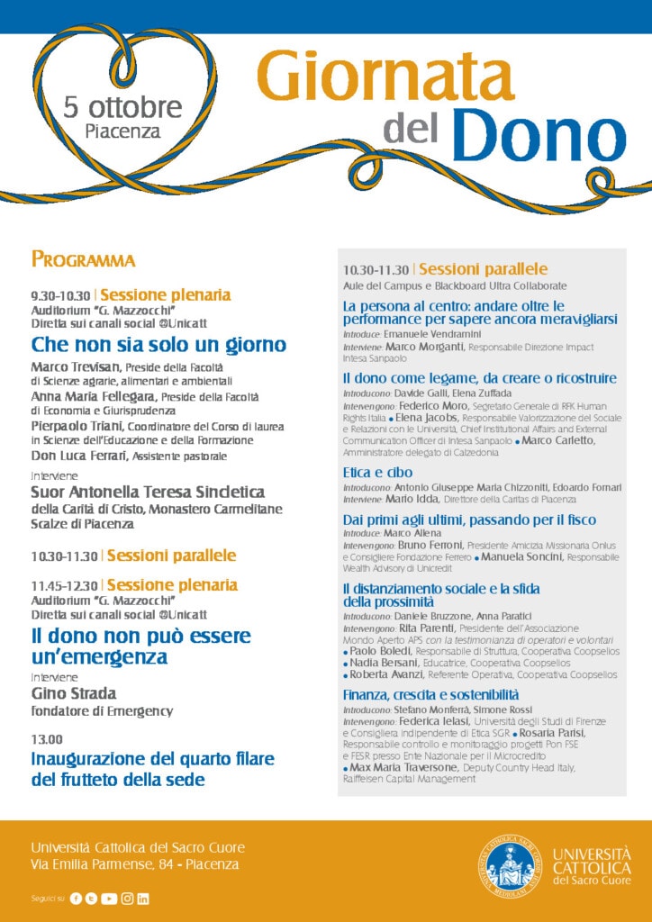 Si celebra lunedì 5 ottobre l’annuale Giornata Nazionale del Dono promossa dall’Istituto Italiano della Donazione (IID). Appuntamento alle 09,30 presso la sede di Piacenza dell’Università Cattolica del Sacro Cuore.
