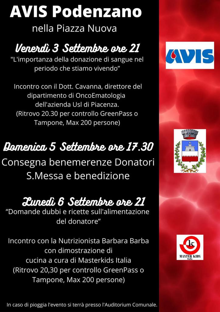 Per la ripresa settembrina Avis Podenzano, in collaborazione con il Comune di Podenzano, organizza due serate informative sulla donazione di sangue e sulla corretta alimentazione. Fra i due incontri, Avis Podenzano festeggerà i volontari più longevi con una cerimonia ufficiale.