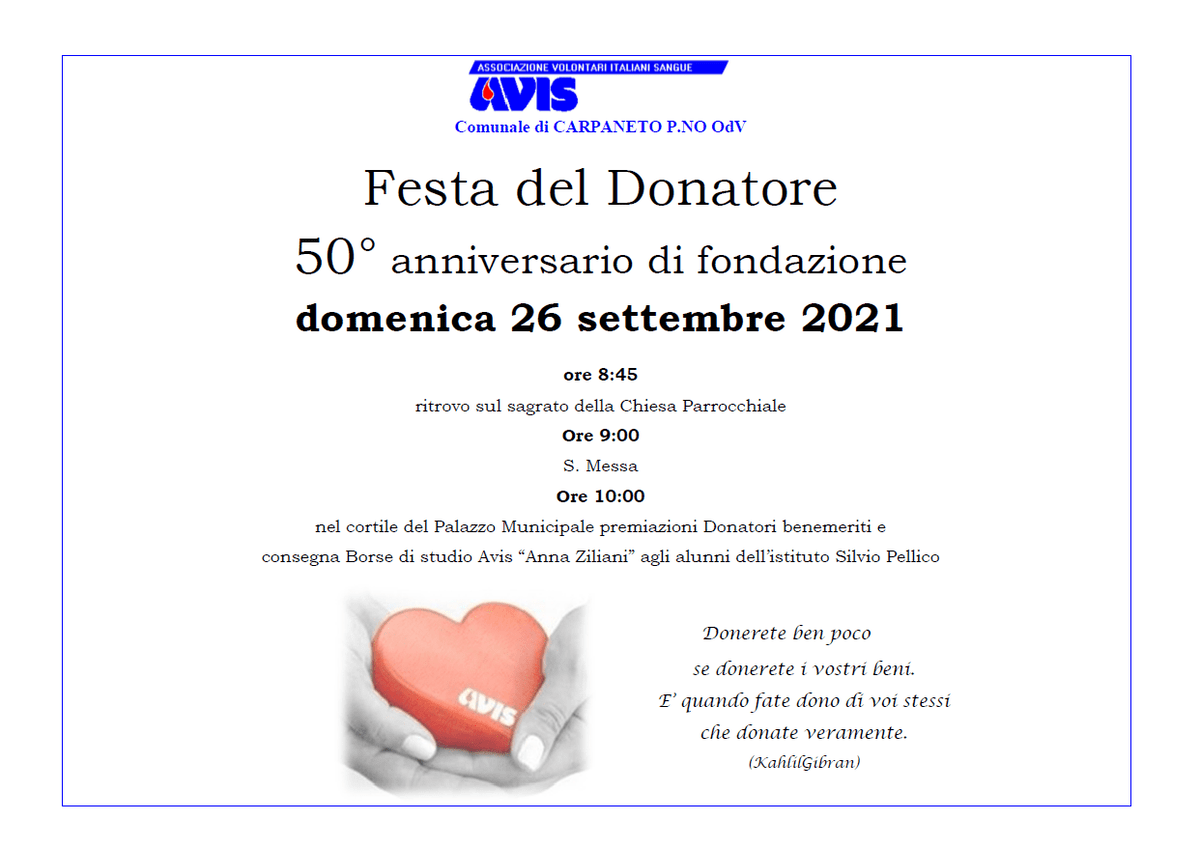 Infine a Carpaneto P.no, sempre domenica 26 settembre, Avis celebra mezzo secolo di vita. Nel quadro della ricorrenza verranno assegnate a sei studenti dell’istituto Silvio Pellico delle borse di studio dedicate alla benefattrice Anna Ziliani. La Sezione locale è molto attenta alle nuove generazioni. Il 14 settembre scorso, in collaborazione con Avis Gropparello, una delegazione dell’Associazione ha visitato gli istituti del territorio e regalato diari scolastici agli studenti.