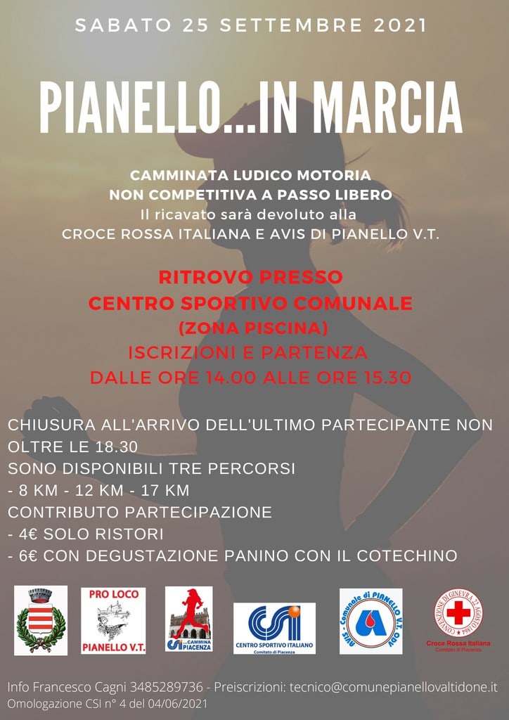Si comincia sabato 25 settembre con “Pianello in Marcia”, una camminata ludico-motoria non competitiva nelle colline della Val Tidone il cui ricavato sarà devoluto alla Croce Rossa Italiana e ad Avis Pianello. Ritrovo presso il Centro Sportivo Comunale di Pianello Val Tidone. Iscrizioni e partenze dalle ore 14 alle ore 15:30. Tre i percorsi disponibili: da 8, 12 e 17 Km.