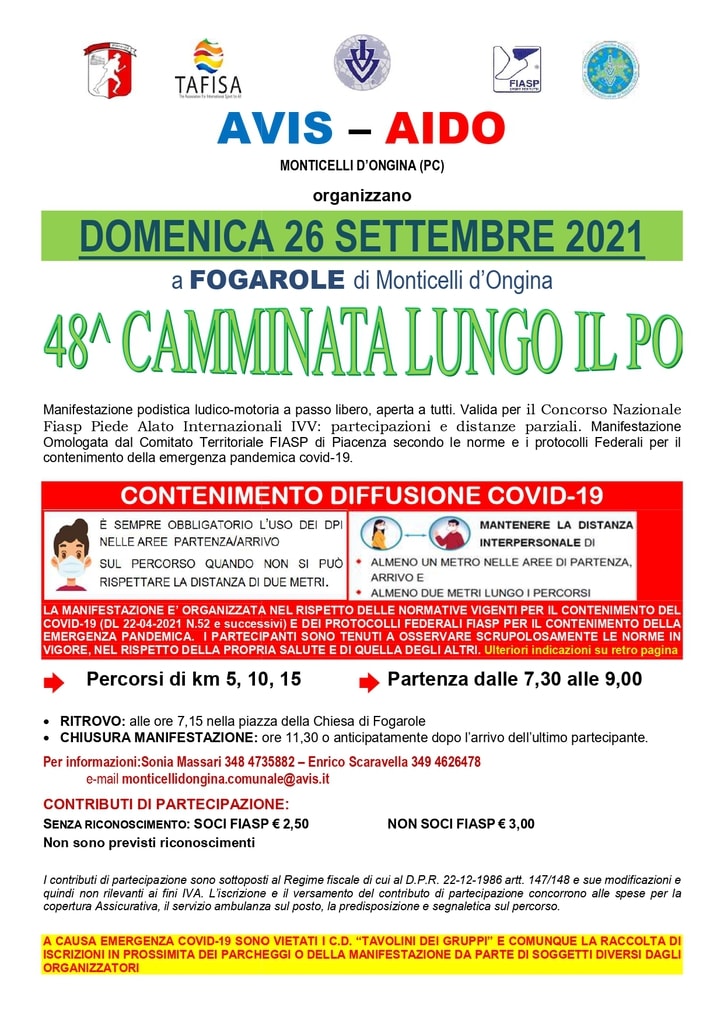Anche a Monticelli d’Ongina si torna a correre grazie ad Avis e Aido che insieme organizzano la “Camminata lungo il Po’”. La manifestazione, giunta alla sua 48esima edizione, si terrà domenica 26 settembre a Fogarole di Monticelli d’Ongina ed è una delle 5 gare sportive promosse durante l’anno da Avis Monticelli. Ritrovo nella piazza della Chiesa di Fogarole alle ore 07:15. Iscrizioni e partenze dalle 07:30 alle 09:00. Tre i percorsi disponibili: da 5, 10 e 15 Km.