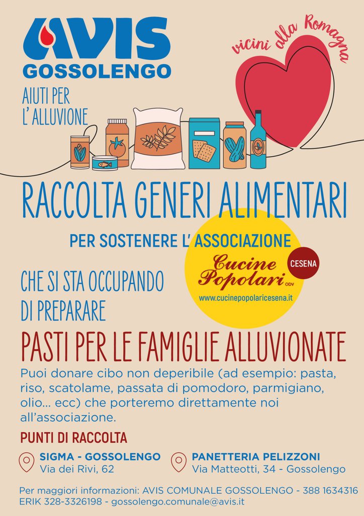Avis Comunale Gossolengo si è infatti mobilitata per aiutare la Romagna, colpita dall’alluvione gli scorsi mesi, lo ha fatto attraverso il contatto con “Cucine Popolari“, iniziativa attivata dall’Organizzazione di volontariato Civibo, costituita come Associazione di volontariato a Bologna il 20 ottobre 2014, per preparare pasti per persone fragili, in difficoltà economiche o anche per persone sole, che oltre al pasto possono trovare anche compagnia. L’iniziativa è stata attivata anche a Cesena lo scorso anno.