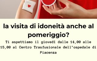 A settimane alterne, al giovedì, presso il Centro Trasfusionale dell'ospedale di Piacenza è possibile donare il plasma  a partire dalle 14,00 fino alle 15,30. Le modalità di prenotazione sono le stesse come per la donazione [...]